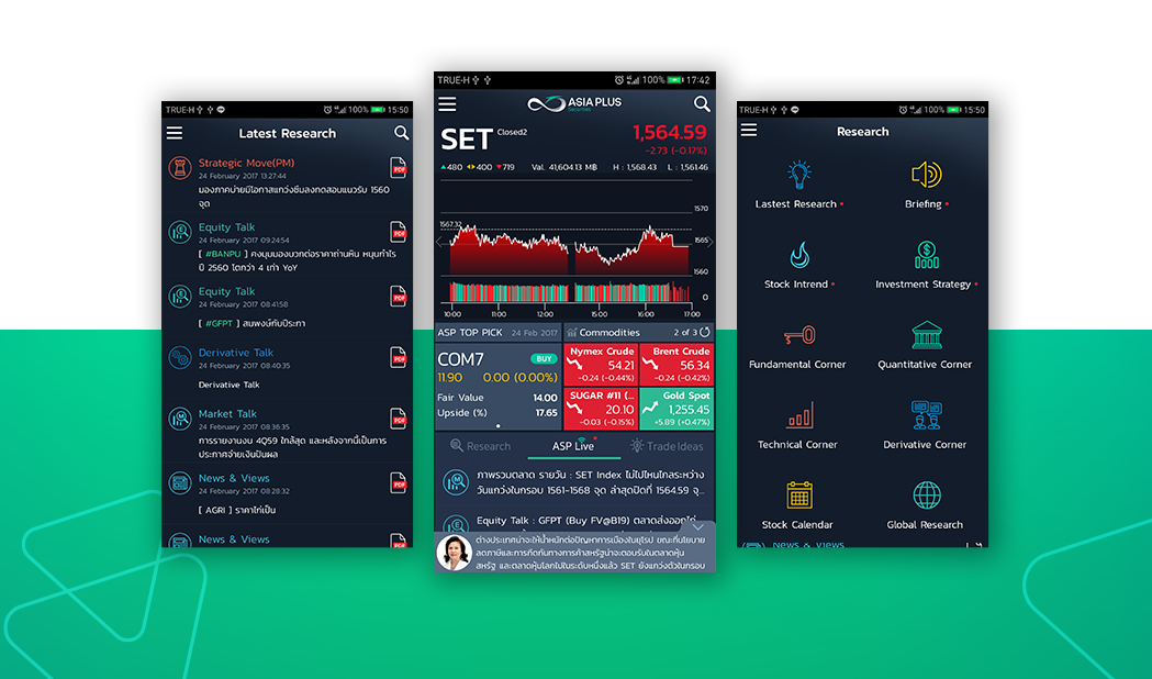 เป็นแอปพลิเคชั่นที่จัดทำขึ้นให้กับ บริษัทหลักทรัพย์ เอเซีย พลัส จำกัด ใช้เป็นเครื่องมือในการนำเสนอข่าวสารที่เกี่ยวข้องกับหุ้นและการลงทุน บทวิเคราะห์ ข้อมูลวิเคราะห์ที่น่าสนใจ รวมถึงมีระบบแจ้งเตือน (Push Notification) ที่จะทำให้ไม่พลาดทุกความเคลื่อนไหว พร้อมทั้งข้อมูลประกอบการตัดสินใจในการลงทุนอย่างครบครัน ยกตัวอย่างเช่น กราฟทางเทคนิค ตารางแสดงข้อมูล รวมถึงข้อมูลทั้งทางด้านพื้นฐานและทางเทคนิค เป็นต้น เพื่อสนับสนุนให้ลูกค้าของ บริษัทหลักทรัพย์ เอเชีย พลัส จำกัด มีข้อมูลที่มีประสิทธิภาพสำหรับการลงทุน หรือซื้อ/ขายหุ้น